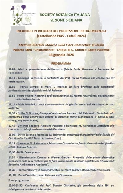 Iniziativa della Società Botanica Italiana – Sezione Siciliana in ricordo del prof. Pietro Mazzola, dedicata agli studi sui giardini storici e sulla flora decorativa di Sicilia, in programma il 16 gennaio 2026 a Palermo presso il complesso di Palazzo Chiaramonte‑Steri, ex chiesa di S. Antonio Abate.